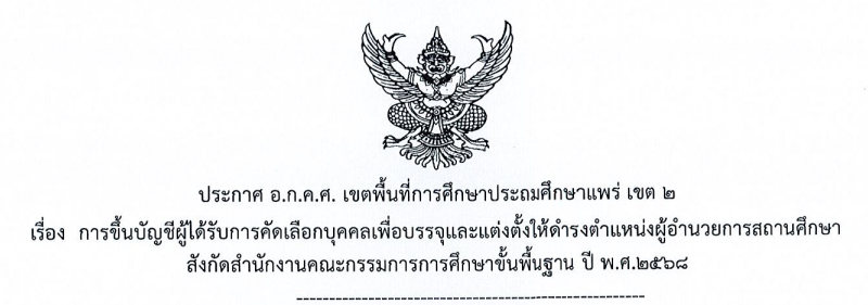 ประกาศ ประกาศ อ.ก.ค.ศ.เขตพื้นที่การศึกษาประถมศึกษาแพร่ เขต 2 เรื่อง การคัดเลือกบุคคลเพื่อบรรจุและแต่งตั้งให้ดำรงตำแหน่ง ผู้อำนวยการสถานศึกษา สังกัดสำนักงานคณะกรรมการการศึกษาขั้นพื้นฐาน ปี พ.ศ. 2568 24 มิถุนายน 202524 มิถุนายน 2025 admin 0 Comments Read more